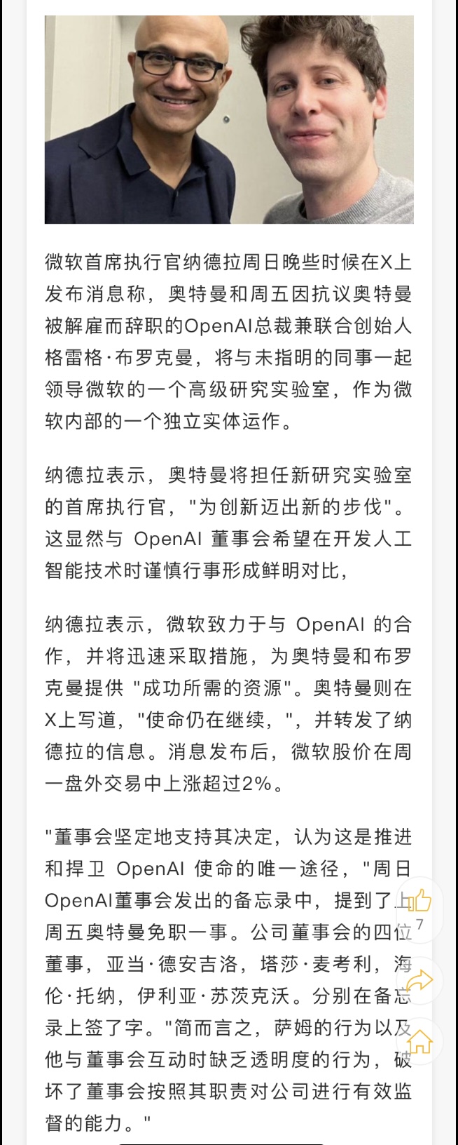 OpenAI 董事会反击资本压力拒绝辞职,微软立马亮出杀手锏,请山姆·奥特曼领导微软公司内部独立实验室。