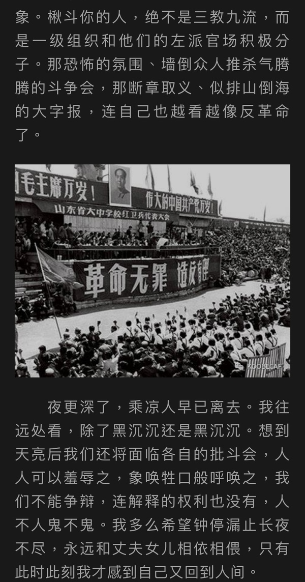 夜更深了,乘凉人早已离去。我往远处看,除了黑沉沉还是黑沉沉。想到天亮后我们还将面临各自的批斗会,人人可以羞辱之,象唤牲口般呼唤之,我们不能争辩,连解释的权利也没有,人不人鬼不鬼。我多么希望钟停漏止长夜不尽,永远和丈夫女儿相依相偎,只有此时此刻我才感到自己又回到人间。