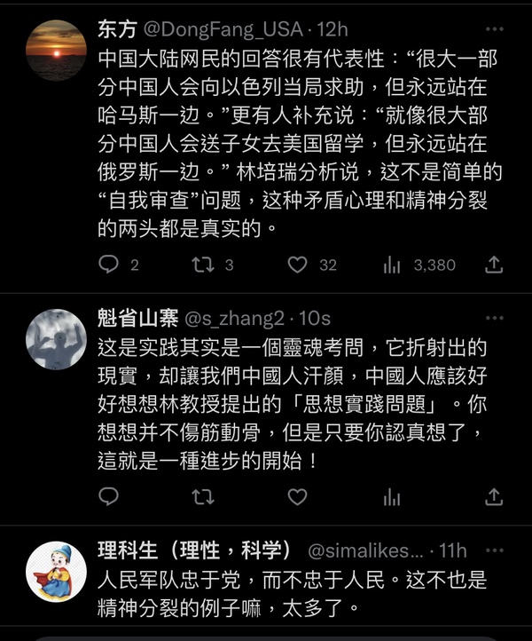 马上有网民回答:“很大一部分中国人会向以色列当局求助,但永远站在哈马斯一边。”更有人补充说:“就像很大部分中国人会送子女去美国留学,但永远站在俄罗斯一边。”