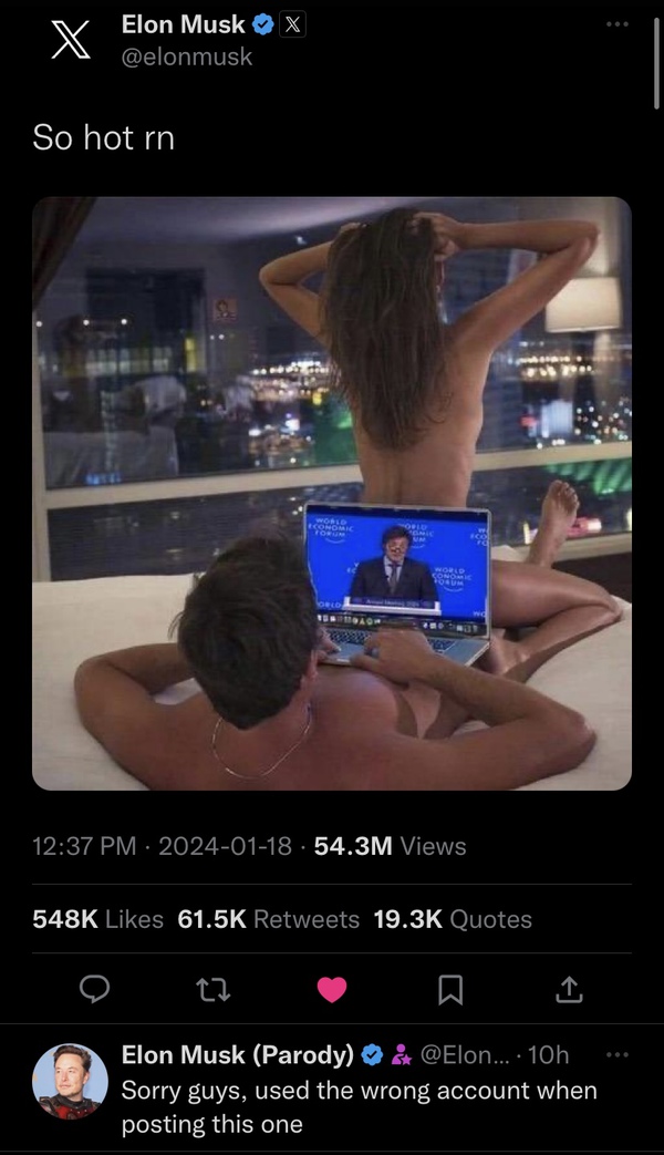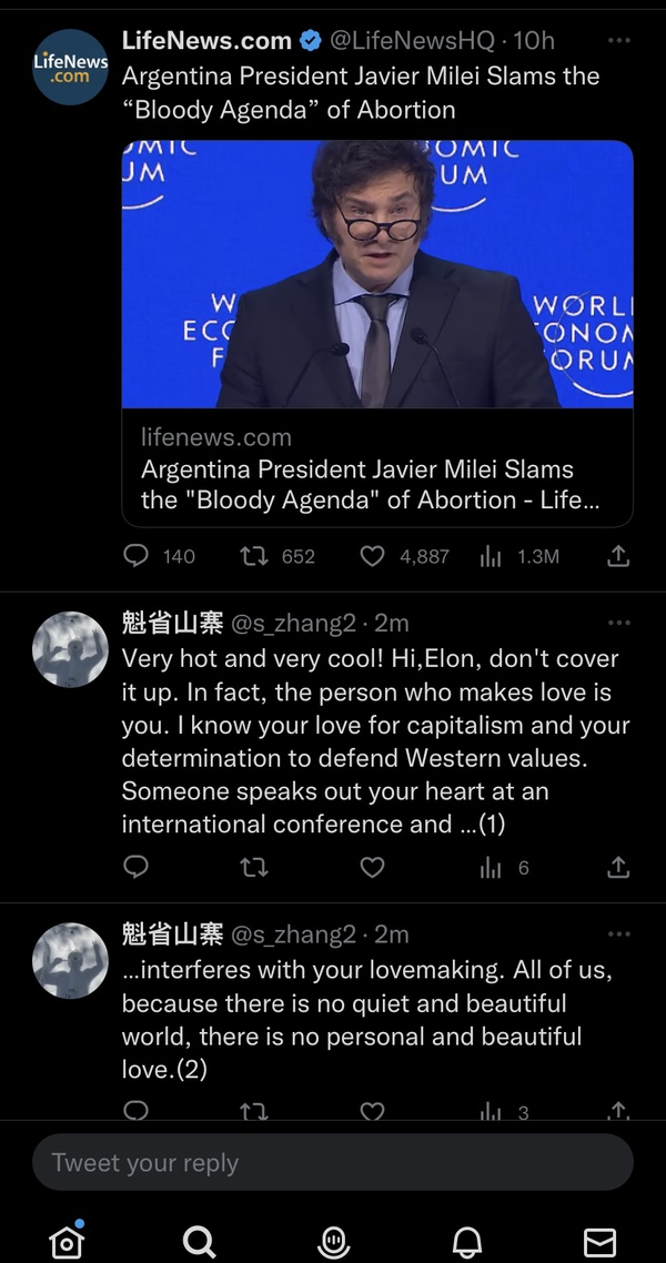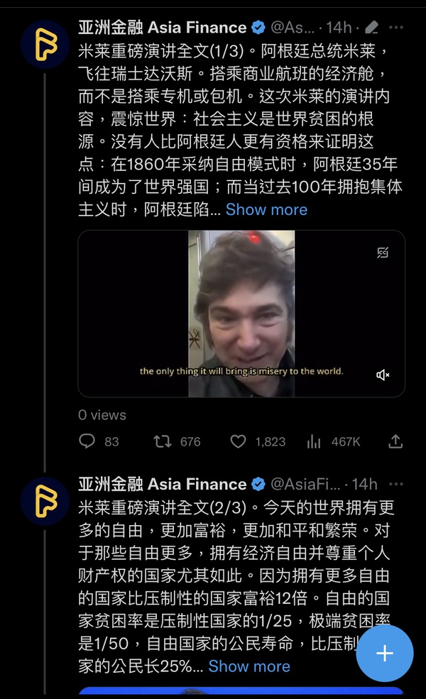 阿根廷新任总统米莱是一位右翼政客,他的很多思想和马斯克很契合。马斯克评价他的这个演讲“是一剂超级壮阳药💊,完美解释了是什么让国家变得更繁荣和更不繁荣”。