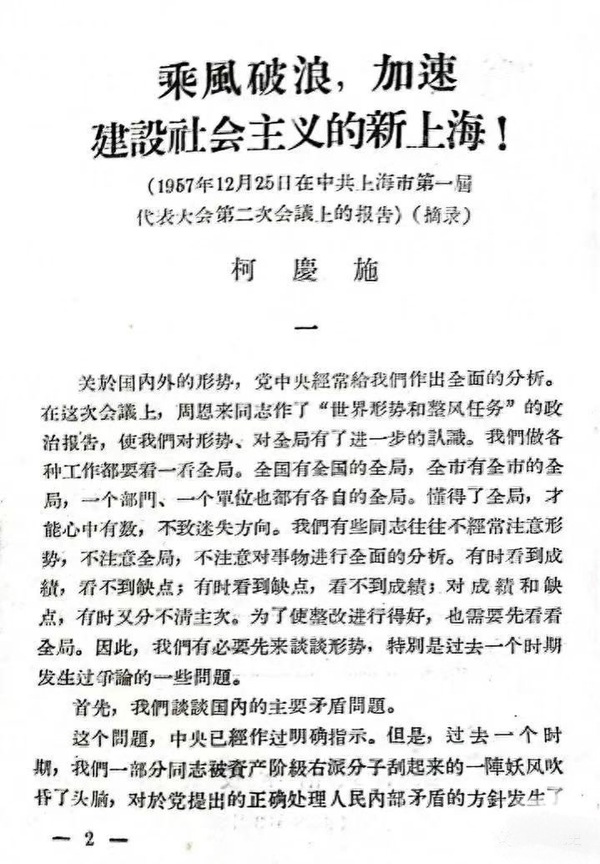 「柯慶施同志在1957年12月25日在中共上海市第一届代表大会第二次会议上的报告」