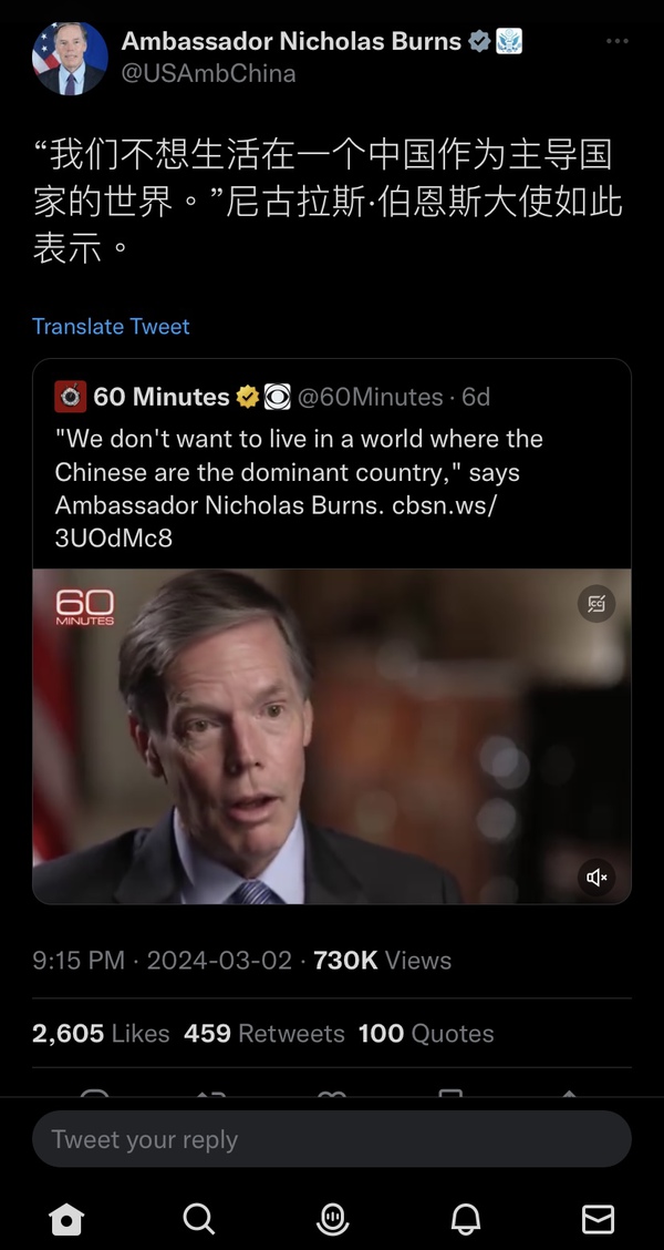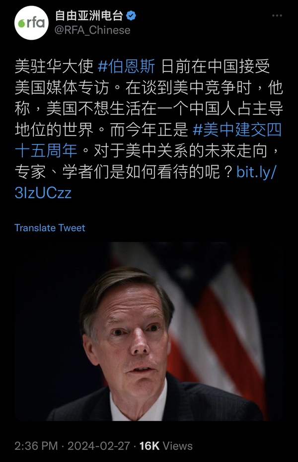 美驻华大使伯恩斯日前在中国接受美国媒体专访。在谈到美中竞争时,大使先生第一次明確公開宣称:美国不想生活在一个中国人占主导地位的世界。