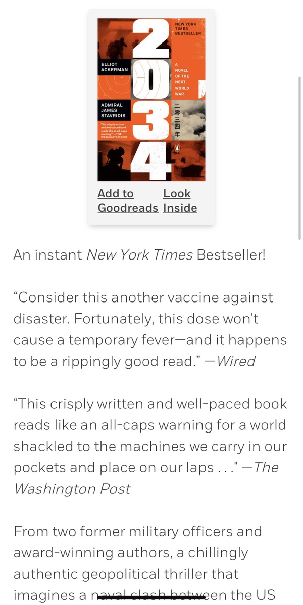 在這部小說中,中國憑藉卓越的人工智慧驅動的網路隱身、衛星欺騙干擾和隱形材料獲得了技術優勢。這時,它有能力對美國太平洋艦隊發動一次成功的突襲。