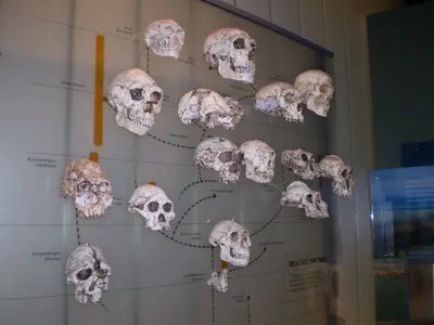 许多到访美国自然历史博物馆的游客,看到所谓人类祖先的猿人 [(apemen)又名 远古人(hominins) 或原始人(hominids)] 标本时都会惊叹不已,比如类似图 1 所示的“我们人类的家谱树”展览。这幅家谱树用多个头骨铸型说明了它们之间的“进化关系”,要重重地敲醒任何敢质疑我们是“高级猿猴”的人。