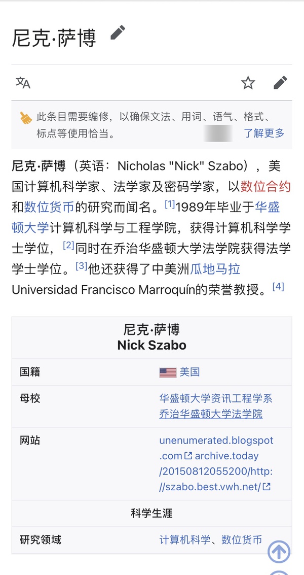 尼克·萨博(英语:Nicholas "Nick" Szabo),美国计算机科学家、法学家及密码学家,以数位合约和数位货币的研究而闻名。1989年毕业于华盛顿大学计算机科学与工程学院,获得计算机科学学士学位,同时在乔治华盛顿大学法学院获得法学学士学位。他还获得了中美洲瓜地马拉Universidad Francisco Marroquín的荣誉教授。