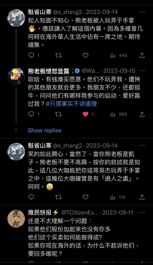 多维真正的大投资人熊老板愤怒指出:“Li X、He X、Chang X, 清楚我投多维压上我和家人的身家性命,我们都签了保密协议。多维如日中天时,被卖给孟老板下属于品海,谁出卖了我、置当时在国内的我于死地?