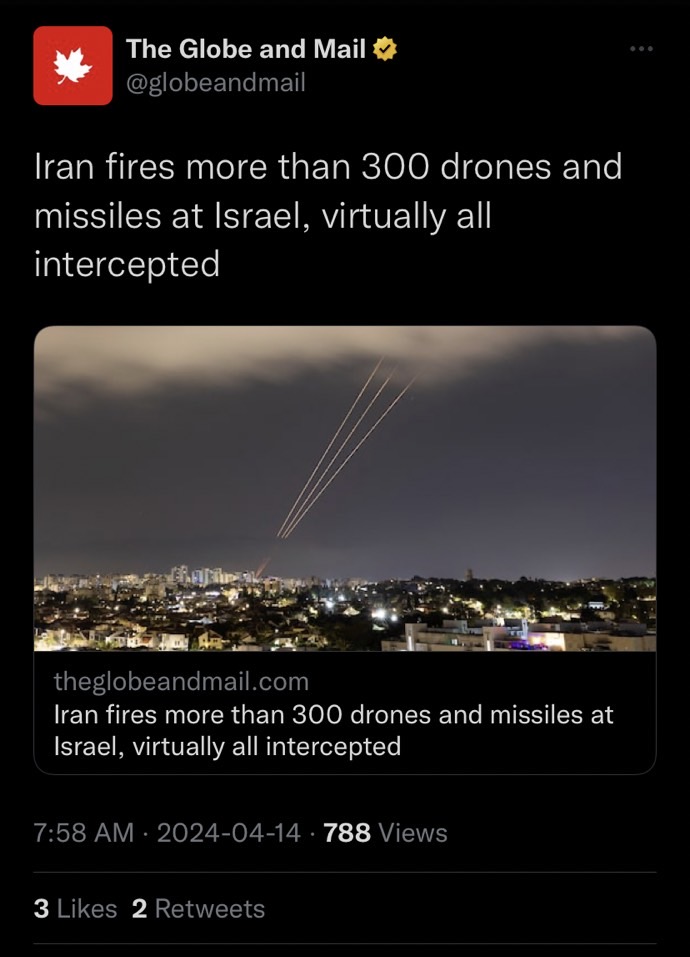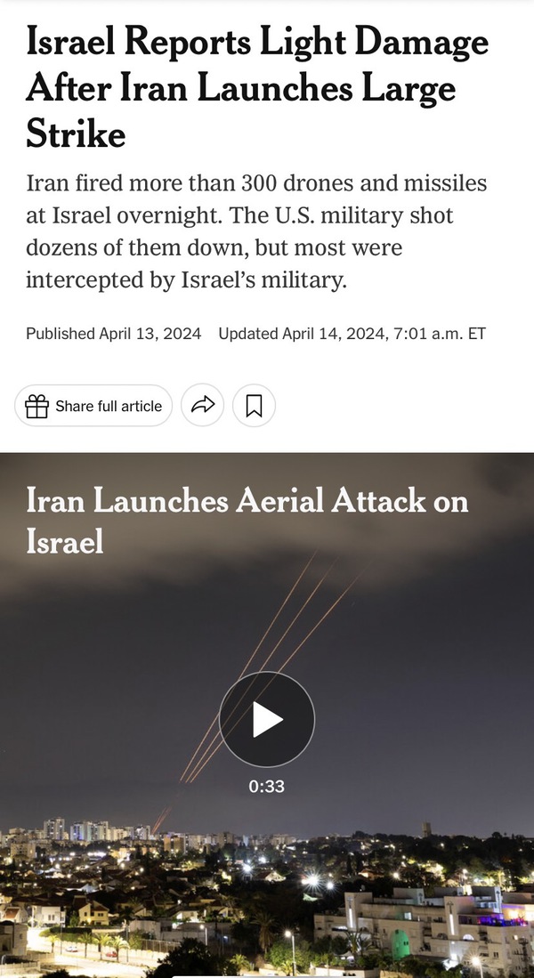 ~以色列在美國协助下,成功破防攻擊,將攻擊無人機與導彈在空中99%擊落,完全沒有造成傷害,社會平靜應對,人民完全信任政府。