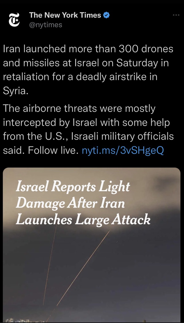 美國擊落了大量甚至還沒來得及到達以色列的無人機,也就是說,美國及其盟國在第三國上空擊落無人機,不讓它們飛往以色列。