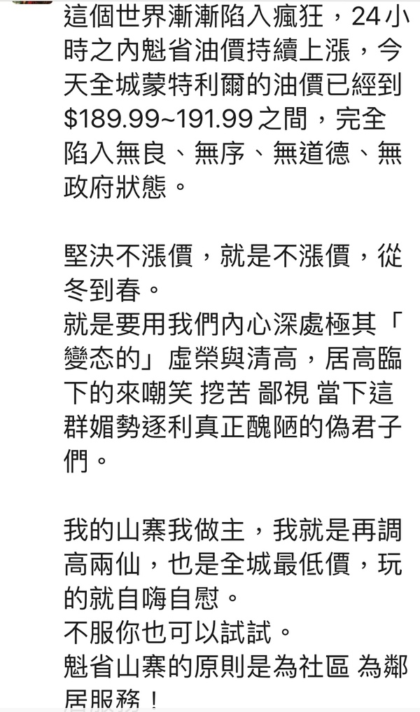 這個世界漸漸陷入瘋狂,24小時之內魁省油價持續上漲,今天全城蒙特利爾的油價已經到$189.99~191.99之間,完全陷入無良、無序、無道德、無政府狀態。