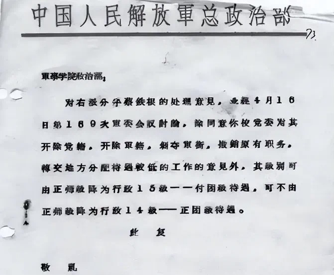 就在撤销判决的第二天,9月18日、中共军事学院党委做出了另一份决定,鉴于常州撤销原判,宣告无罪,故决定:“恢复蔡铁根同志的政治名誉,恢复党籍,恢复原级别……”
