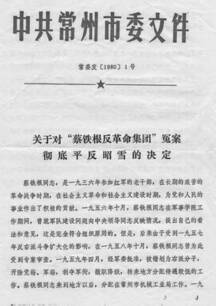 9月17日,江苏省常州市法院终于正式做出了撤销原判的判决书。判决书说:“经复查,事实证明原判决认定的事实和使用的法律都是错误的,是惨遭林彪、‘四人帮’极左路线的迫害,纯属冤案。现依法改判如下:一。撤销原判……二、宣告蔡铁根无罪,推倒一切诬蔑不实之词,予以彻底平反昭雪,恢复名誉。”