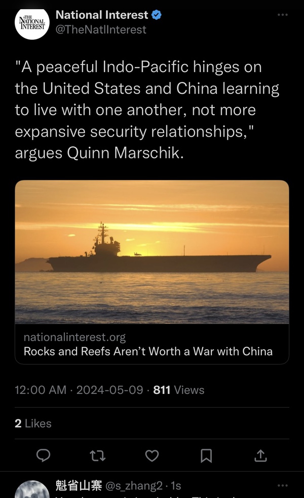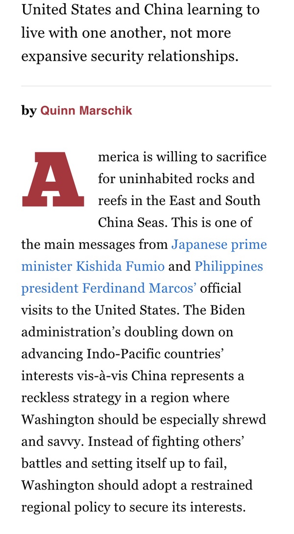 「America is willing to sacrifice for uninhabited rocks and reefs in the East and South China Seas. This is one of the main messages from Japanese prime minister Kishida Fumio and Philippines president Ferdinand Marcos’ official visits to the United States. The Biden administration’s doubling down on advancing Indo-Pacific countries’ interests vis-à-vis China represents a reckless strategy in a region where Washington should be especially shrewd and savvy. Instead of fighting others’ battles and setting itself up to fail, Washington should adopt a restrained regional policy to secure its interests.」
