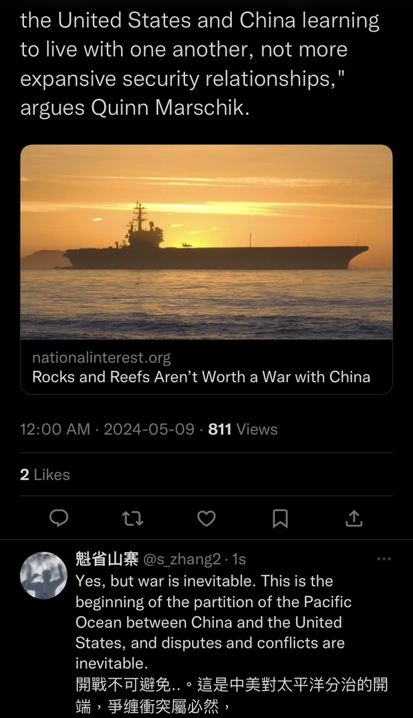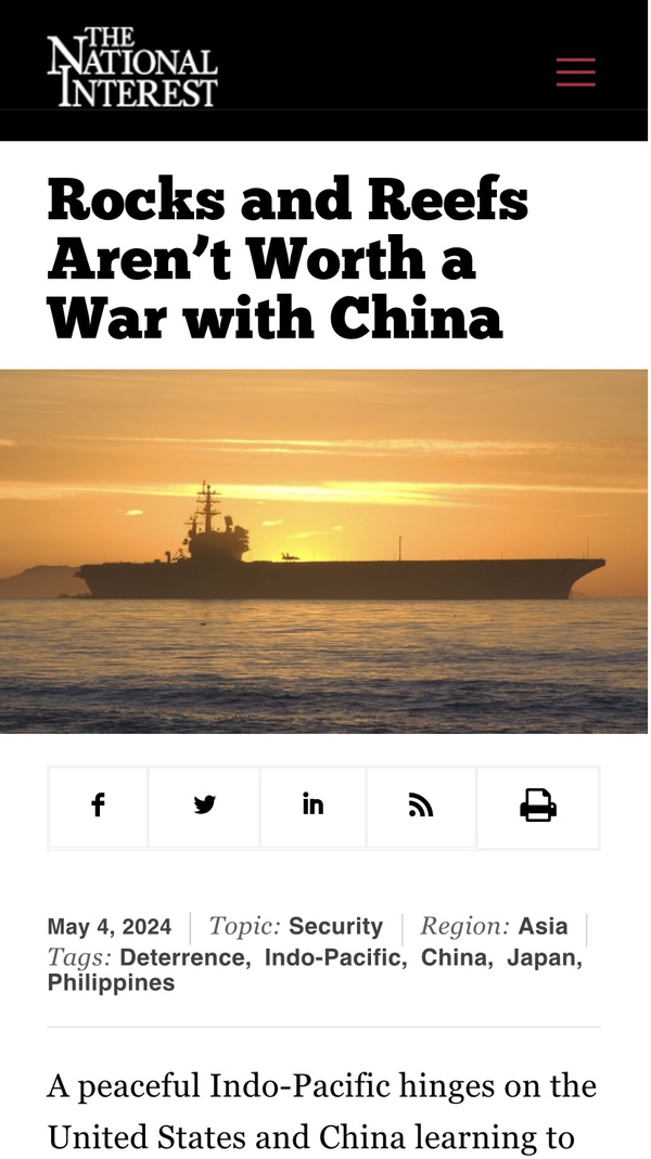 即「华盛顿不应该拿美国的切身利益冒险,而应该背弃其保卫南海和东海无人居住的岩石、珊瑚礁和岛屿的承诺。为尽量减少风险,应撤销这些不可信的承诺。