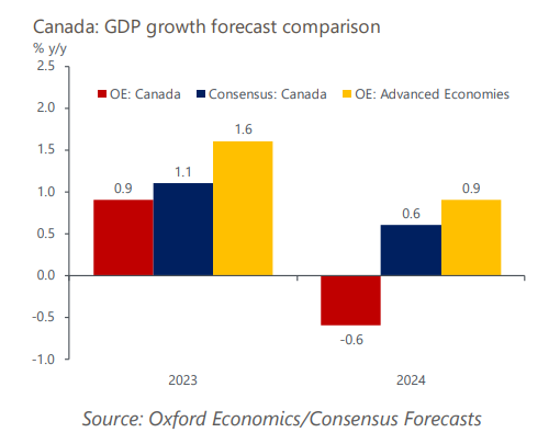由于高利率的滞后影响继续渗透,加拿大经济在 2024 年开始时仍将深陷衰退。 不过,随着加拿大银行开始降息、通货紧缩持续以及全球经济增长改善,我们预计 2024 年下半年将出现温和复苏。 我们预计,2024 年的经济表现将远低于共识,也逊于其他发达经济体。