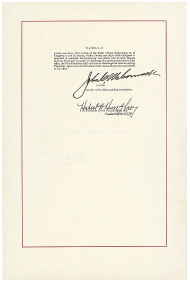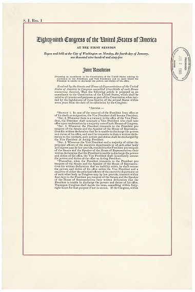 《美利坚合众国宪法》第二十五修正案(英語:Twenty-fifth Amendment to the United States Constitution)簡稱「第二十五修正案」(Amendment XXV),对美国总统和副总统职位因各种原因出现空缺时的继任程序作出了修正和规定,并增加了由副总统和内阁成员判断总统是否能够继续履行职责的新条款。宪法第二条第一款第六节中所规定的继任程序遣词并不明确,其中没有说明“如遇总统被免职、死亡、辞职或丧失履行总统权力和责任的能力时”,副总统究竟应该成为新任总统还是代理总统,亦未规定若副总统“被免职、死亡、辞职或丧失履行时”,副总统权力和责任的能力时又该如何處理,第二十五修正案对这两方面问题都作出了明确的回答。修正案于1965年7月6日由联邦国会提出,1967年2月10日获得了足够数量州的批准而生效。