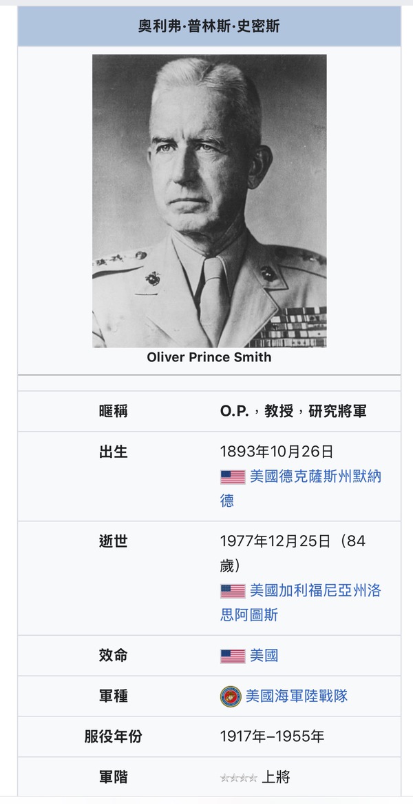 美军长津湖战役主将:奧利弗·普林斯·史密斯(英語:Oliver Prince Smith,1893年10月26日—1977年12月25日)是參與過第二次世界大戰和朝鮮戰爭的美國海軍陸戰隊四星上將。他最著名的是在指揮美國第1海軍陸戰師在長津湖戰役的戰鬥中,他對他的部下說:「撤退個鬼!我們不是撤退,只不過是從不同的方向進攻。」(Retreat, hell! We're not retreating, we're just advancing in a different direction.)