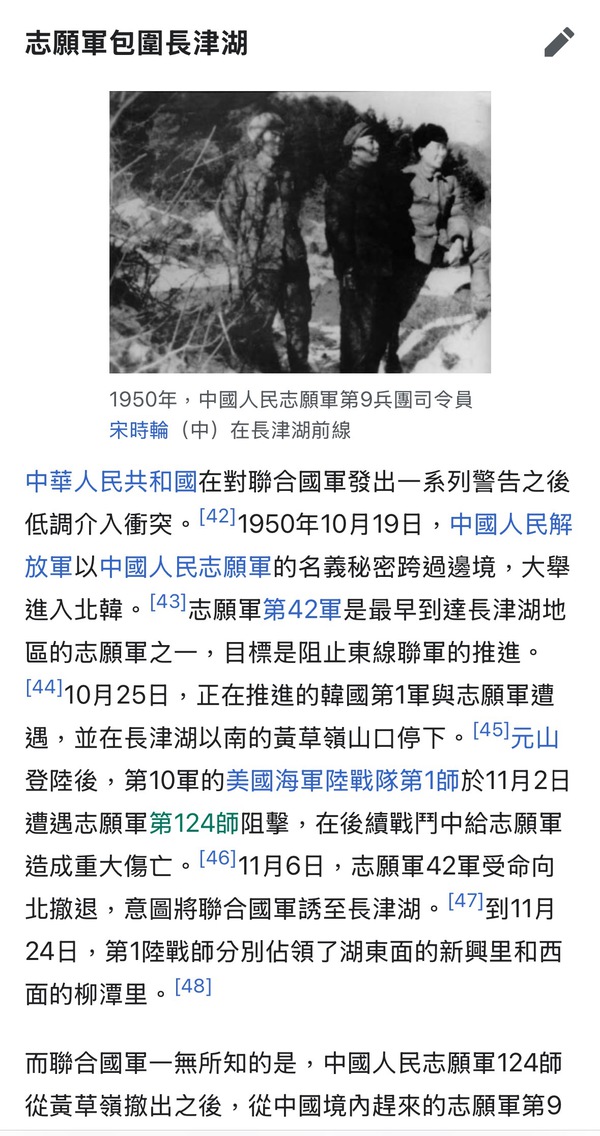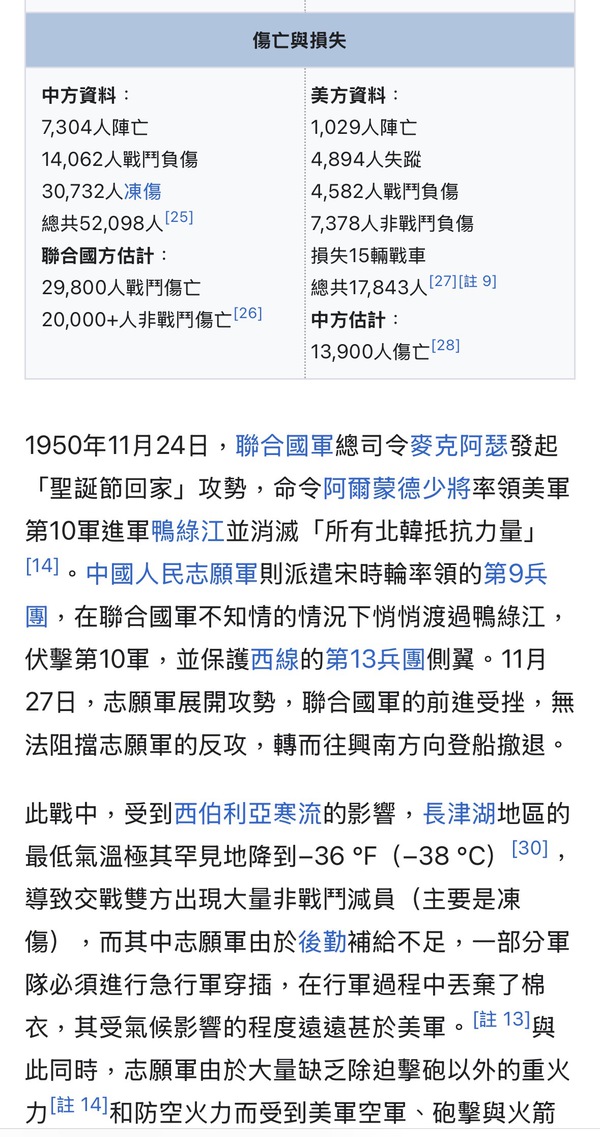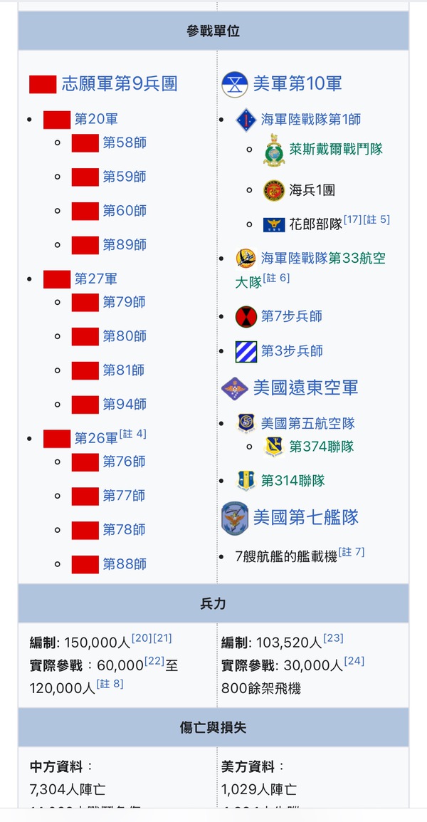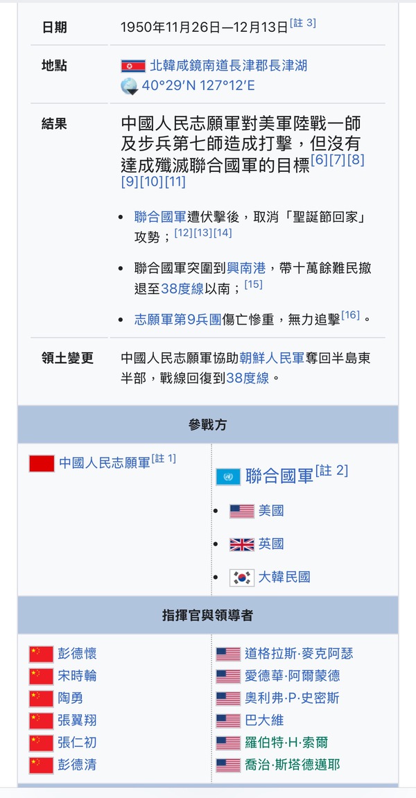 【简介】長津湖戰役(韓語:장진호 전투/長津湖戰鬪;英語:Battle of Chosin Reservoir。於中華人民共和國又稱抗美援朝第二次戰役東線,是韓戰中中國人民志願軍參戰後的一場重要戰役,屬於第二次戰役的東線部分。美國海軍陸戰隊第一師(師長奧利弗·史密斯少將、整建制參與戰鬥)、美國陸軍第7步兵師(師長巴大維少將)下轄的4個師屬野戰砲兵營和第31團級戰鬥隊(中國方面誤稱為「北極熊團」)、美國陸軍第3步兵師下轄的3個團級戰鬥隊(師長索爾少將,負責保護左翼)為聯合國軍主要地面作戰單位,約合30,000人.同時擁有空中支援(29)。