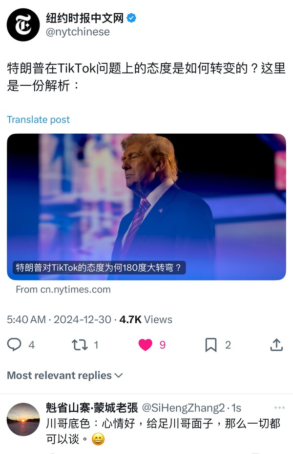 事实上,自2020年以来,TikTok在美国的命运就一直备受关注。从最初被指控威胁国家安全,到后来面临可能被强制出售的风险,这家短视频平台始终处于风口浪尖之上。如今,在周受资与特朗普会面之后,情况出现了转机。證實了「說客、人情、面子、聽話、尊重、談判」的重要性,我个人的的總結既是:川哥的底色。