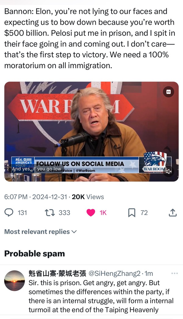 Bannon: “Elon, you’re not lying to our faces and expecting us to bow down because you’re worth $500 billion. Pelosi put me in prison, and I spit in their face going in and coming out. I don’t care—that’s the first step to victory. We need a 100% moratorium on all immigration.”