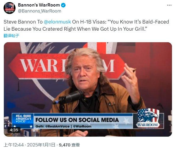 美媒报道指出,自马斯克等人为H-1B签证辩护,引发MAGA忠诚支持者的强烈批评后,班农几乎没有停止过对马斯克的抨击,今天大骂移民是对西方文明的威胁,而“科技巨头寡头”却支持H-1B签证项目,明天就怒喷H-1B签证是巨大“骗局”。