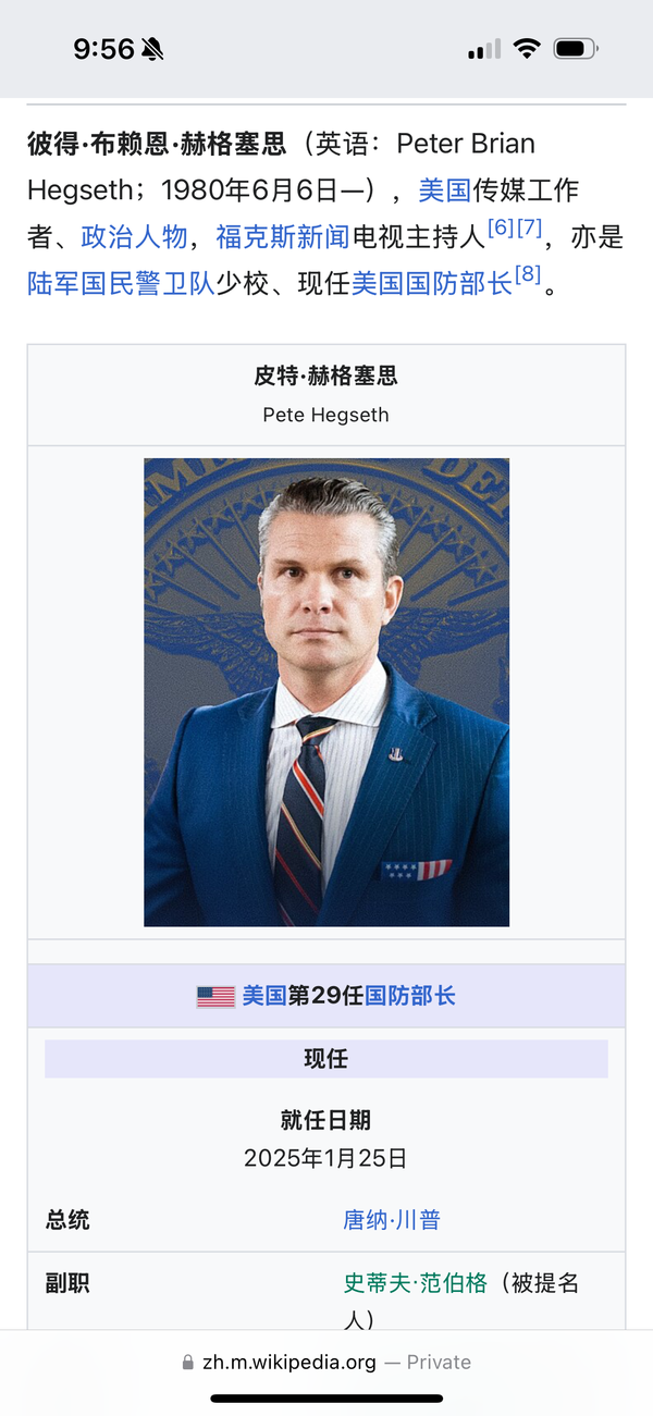 赫格塞斯剛剛通過認證,參議院投票結果:50:50,加上萬斯副總統的一票,以51:50通過參院認證,成為下一任的國防部長,也是美国历史上最年輕的國防部長之一(在美國防長職位歷史上排第二,比肯尼迪總統的國防部長Robert McNamara就任時年長6天時間)