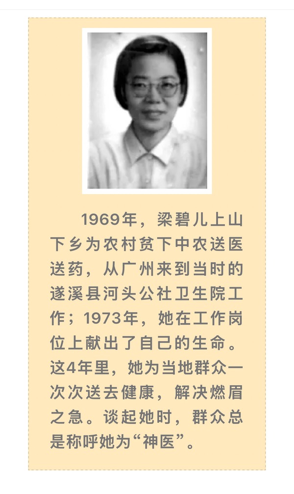 1969年,梁碧儿上山下乡为农村贫下中农送医送药,从广州来到当时的遂溪县河头公社卫生院工作;1973年,她在工作岗位上献出了自己的生命。这4年里,她为当地群众一次次送去健康,解决燃眉之急。谈起她时,群众总是称呼她为“神医”。