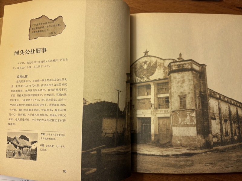 在我童年中。小鎮唯一娛樂的地方是公社禮堂,禮堂建於50年代中期,據說是河頭公社的漁民到南海捕魚,被外國軍隊抓住,我們的漁民寧死不屈,堅持說在中國領海作業,拒絕認罪,英雄的漁民回來後,上級獎勵了兩萬元建了這個禮堂,還有一種說法是漁民的船被外國船碰沉了,用賠款興建的。小時候,我們經常到禮堂玩,聽說有鬼,我們玩得更小心、更刺激,關於建禮堂的原由,我最近才聽父親說,是大躍進時代,全公社的社員用砍樹賣木材的錢修建的。