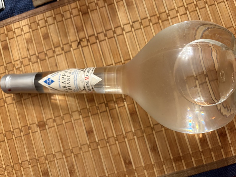 他帶我走到吧台前,一位滿臉鬍子的服務生見到弗蘭克,咧嘴一笑,熟練地從冰箱裡掏出一瓶帶著薄薄冰霜的酒。瓶身上寫著“Grappa”,我當時還不知道那是什麼,只覺得那冰霜在燈光下閃著微光,像個神秘的邀請。服務生拿來兩個特有的小盎司杯,倒滿了兩杯透明的酒液,弗蘭克讓我端杯嗅嗅酒,酒香撲鼻,空氣中帶著一點果香,又有點辛辣刺鼻,