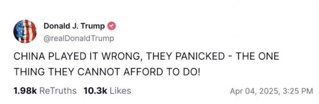 美国总统川普(Donald Trump)周五通过其社交媒体平台“真相社交”就中国政府对美国“对等关税”宣布一系列反制措施、包括对原产于美国的所有进口商品加征34%关税后,宣称中方“玩错了”。