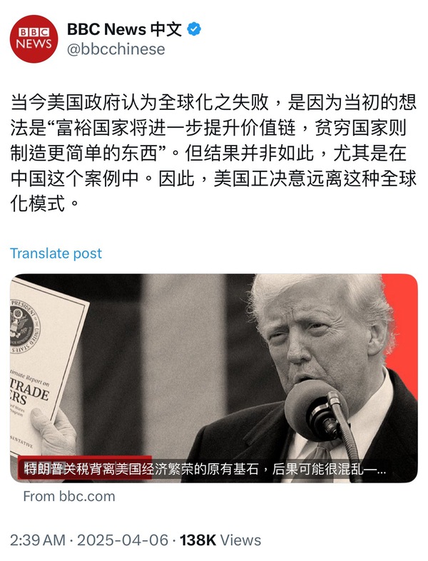 美國的長期盟友英國BBC專欄文章分析批評道:「特朗普关税背离美国经济繁荣的原有基石,后果可能很混乱。」