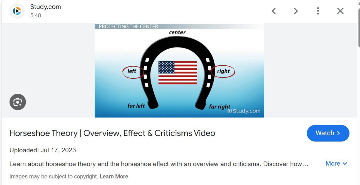 「馬蹄鐵理論」(Horseshoe Theory)是一個描述政治光譜中極端主義的理論,認為極左派和極右派在某些方面有著驚人的相似之處,且這種相似性比他們與中間派的共同點還要多。 換句話說,極端主義的兩端並非完全對立,而是更像馬蹄鐵的兩端,雖然分開,但卻比其他部分更靠近,兩者在某些觀點和行為上可能趨於一致,甚至互相影響。