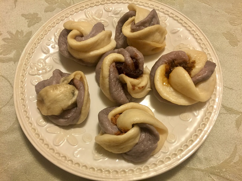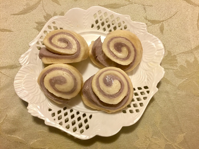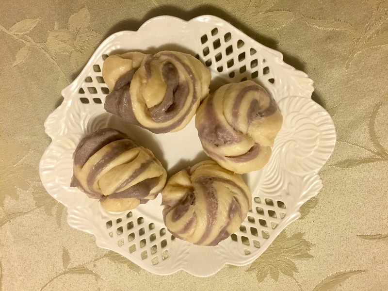 雨还在不紧不慢地下着,花园进不去,隔着玻璃门看着园子里的花草尽情地吸着雨水,真为它们高兴。忽然灵机一动,既然种不了花,何不做花,我来做即好看又能吃的花。趁着中午咖啡的余威尚在,马上动手和面。先和了一个白面团,昨天朋友给我的一个大紫薯还在,我又用紫薯和了一个紫面团。