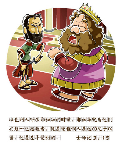 接下来,耶和华使“摩押王伊矶伦强盛,攻击以色列人。伊矶伦招聚亚扪人和亚玛力人,去攻打以色列人,佔据棕树城。” 这里明确告诉我们,是耶和华使摩押强盛兴旺,从迦南的南边杀上来,占了以色列人的城,压迫以色列人,“于是以色列人服侍摩押王伊矶伦十八年”。看来以色列遭到侵略,不是因为民族弱小,敌人强大,根本的原因是因为神使敌人“强盛”起来收拾他们。这个南边过来的侵略者称王称霸,比北方的美索不达米亚过来的侵略者,多压迫了以色列人十年后,以色列人才想起来“呼求耶和华”,寻求帮助,是不是受压迫也能练得更逆来顺受啊?以色列人一时半会儿想不起来求靠耶和华,耶和华可是一分钟都没耽误就回应了他们。“耶和华就为他们兴起一位拯救者,就是便雅悯人基拉的儿子以笏,他是左手便利的。” 便雅悯这个名字的原意是“右手之子”,以色列民是以右为上的,这个”右手之子”生的”左手便利”的后代,不知道是不是一个被族人们瞧得起的人,不管族人看不看得起他,神“兴起”他成为族人的”拯救者”。