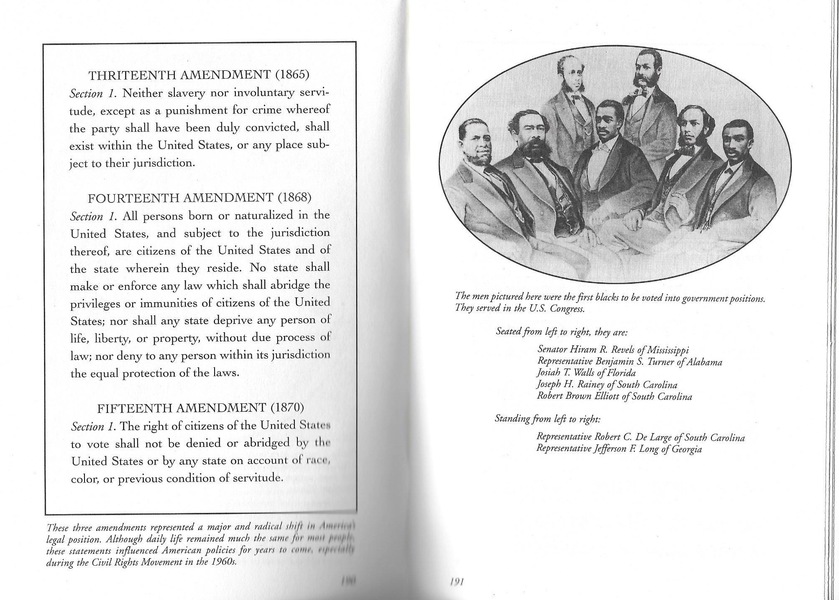 1867-1877年被称为激进重建期,南方各州被民主党种族主义者控制的政府拒绝承认黑人的平等权益而导致严重的动荡和暴力,国会在1867年通过法案对南方诸州实行军事管制,同时通过了宪法第十四修正案(1868修订)保证所有在美出生或归化的人公民身份。1870通过了宪法第十五修正案,赋予所有男性公民投票权(不论种族、肤色或者以前的仆役身份)黑人终于可以投票了。相比之下,女性的投票权是1920才有的。
