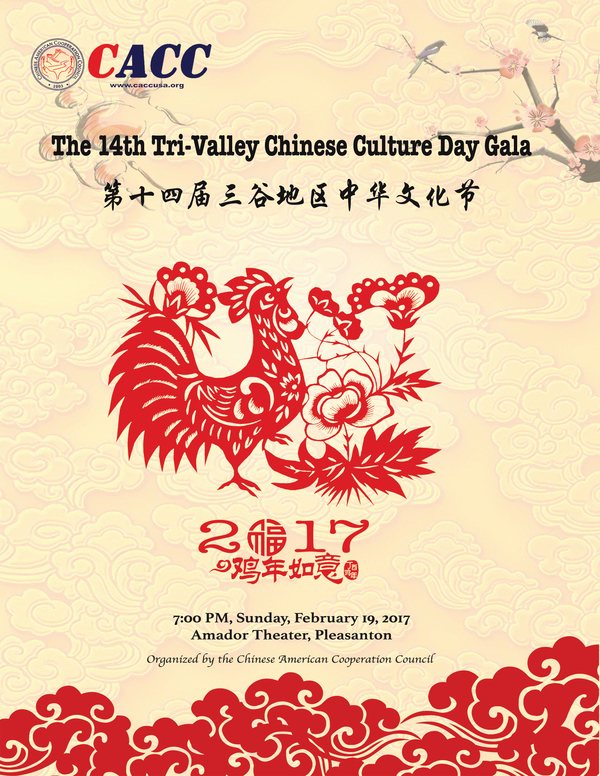 春回大地百花争艳,福满三谷金鸡报晓. 中国农历鸡年春节刚刚过去,东湾三谷地区的华人社区仍笼罩在一片浓浓的节日气氛中, CACC(Chinese American Cooperation Council) 理事会经过认真筹备,于2月19日在Amador剧场,在位义工,老师,学生和家长的大力支持下,连续第14年为大家奉献了一场精彩的春节联欢晚会。