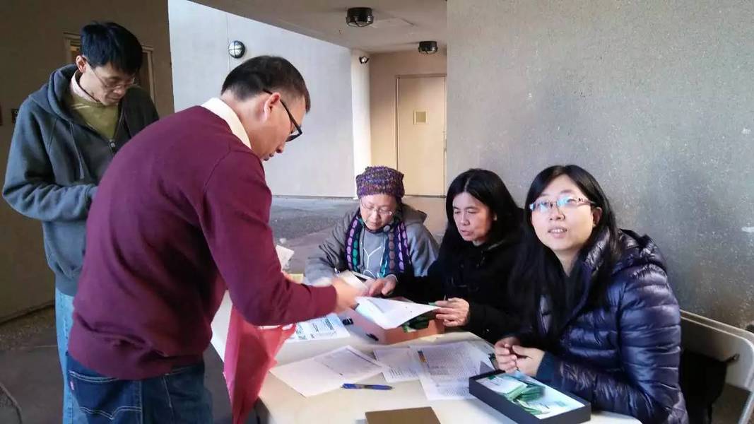 CACC理事Hui Lu(右1)与Gracie Chen(右2), Karen Zhu(右3)顶着寒风在售票。