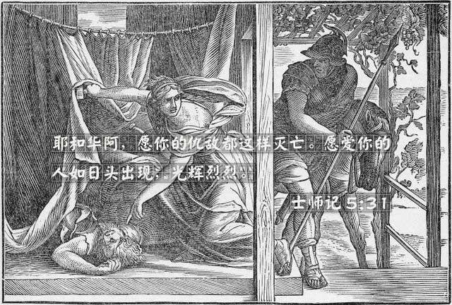 士师记的第四章讲的是神借着女士师底波拉,她的助手巴拉,和女豪杰雅亿,救以色列人脱离迦南人欺压的故事。接下来的第五章,是底波拉和巴拉在战胜仇敌的当时,联手写的一首赞美感恩诗歌。这个血腥故事和这首美好的诗歌在经里首尾相应,读者的情绪要急转弯才能适应吧。前面的一篇文章里,提到左撇子以笏行刺摩押王伊矶伦,用一把两刃剑刺穿他的肚腹的故事。这一篇文章里也要提一个行刺的故事,而且刺客是个女流,这个强悍的女人名叫雅亿,她用锤子把固定帐棚的撅子钉进了敌人的太阳穴。这两个故事都够血腥的。读这种故事时,难免要问一问,神在圣经里给我们讲这类的故事,要告诉我们什么呢?这个问题的答案最好早点找到,要在经文里找。我发现答案是在这两章的最后一节,现在就给大家吧。“耶和华啊,愿你的仇敌都这样灭亡,愿爱你的人如日头出现,光辉烈烈!” 神有至高无上的权威,让祂的仇敌和爱祂的人的结局天差地别,谁能不服气呢?