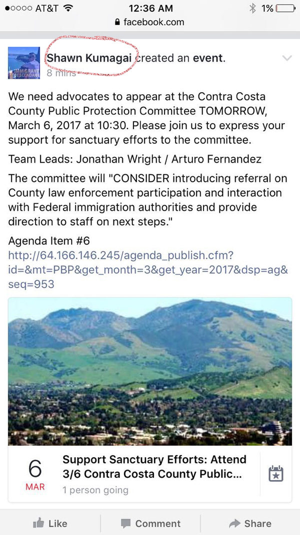 下一个就是康郡了,4/3 contra costa county讨论庇护县问题,急需大家参与,本周一的会议支持方远超反对方,下次会议不可重蹈覆辙!咱们要学习Dublin的成功经验,需要人气!基本上就是反对的人多就不过!小小的Dublin惊动了一两百人,康郡这么大的地方,争取多去点!自己的家园边上的事情需要咱们每个人关心。领导Dublin抗争包庇提案的Alvin Lui给支持者们的信中说,他要给宝贝女儿一个安全的环境,作为妈妈我也是这么简单的想的。