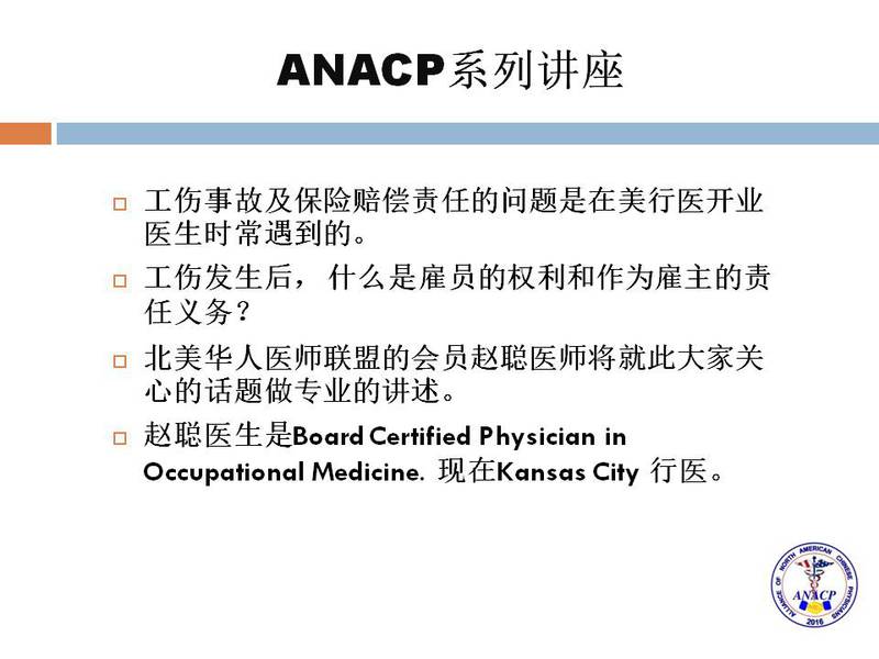 在开业行医同时,医生们不仅需面临医学知识日新月异快速发展的挑战,而且还时常遇到在工作环境中可能发生的工伤,事故及保险赔偿责任方面的问题。当工伤发生后,需了解作为雇员的权利和作为雇主的责任和义务。为此,北美华人医师联盟(ANACP)会员,Occupation Medicine 专业赵聪医師于3月11日星期六晚就此大家关心的话题奉献了一场专业生动的讲座。