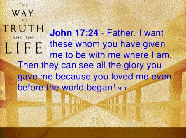 The Son loves the believers the same as His Father does. He prayed for reunion with all believers. He would soon be led away to His trial and crucifixion. After His ascension He would not physically be with His believers for a long time, until they are reunited with Him. It was for this reunion that our Lord and Savior prayed, "Father, I want those you have given me to be with me where I am, and to see my glory, the glory you have given me because you loved me before the creation of the world." The echo of this prayer which has been in all believers' hearts will last until the Lord's second coming. The Lord's great desire is for His own to be with Him in glory in heaven to see fully the glory of His Father and to share the love between the Father and the Son.