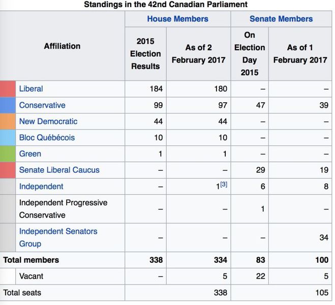 目前一共338个议席,有5个空缺,4月补选以后会补上。实际议员目前334位。今天的投票结果是201Vs 91。大家可以算算多少人没有投票?42位缺席!!!(大部分是自由党和NDP国会议员缺席,因为各种原因无法来投票,包括土豆缺席议会投票去一个华人老人院帮他的前任办公室秘书拉票)这就是我们的成绩呀!