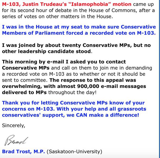 社会的堕落不是一朝一夕,好转也需要时间。我们预计了M-103会通过,但是所做的努力都没有白费。在保守党党领候选人Brad Trost推动下,大家所写的90万封email唤起了大多数保守党人的责任心和部分NDP和自由党议员的良知。今天的投票结果比预期的要好。