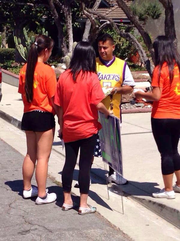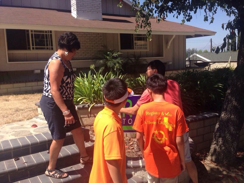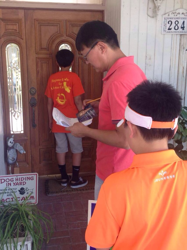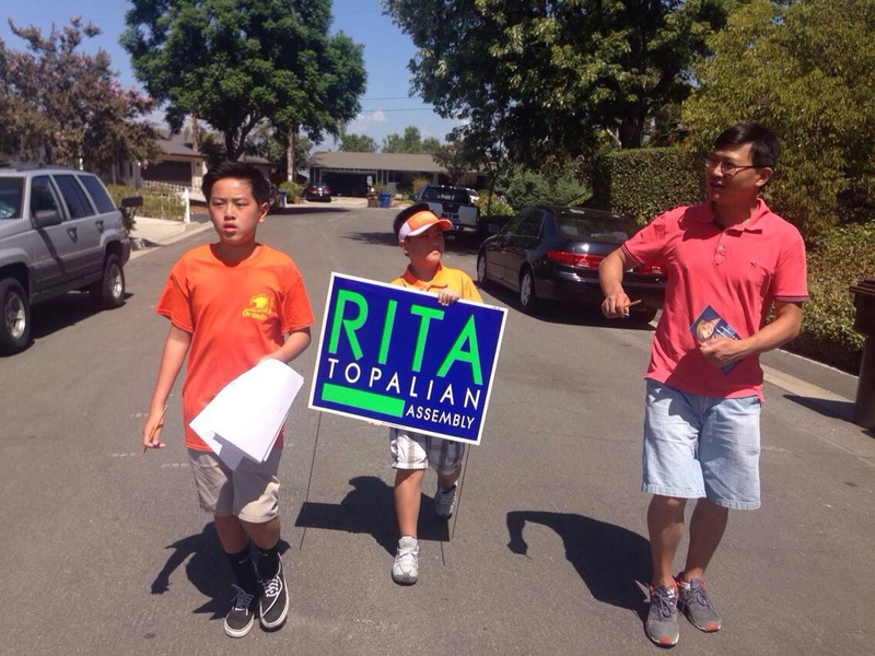 扫街:顾名思义拿着扫把到处扫?可为你所认可和支持的政治候选人去挨家挨户登门介绍、宣传,主动出来投票等这也叫政治扫街?真正听说和实际操练只有六个月时间!今天带着二孩子主动做义工为自己所支持的众议院候选人Rita topalian!拿着rita的flyer,牌子等去登门拜访和上周的phone banking(打电话去投票和民卷问达)不一样!这次是面对面去穿街走巷的敲门!对于不同的族裔和年龄需要不同方式的宣传:亚裔从教育方面宣传,不管是白人还是其他族裔的老年人要从医疗保险等方面,年轻和从事自己事业者要从税务等方面宣传!也就是说要对选此候选人对选民以后的福利,教育及如何维护公民利益等做很多功课后才能去支持和拉选票??儿子开始没有进入状态,后去敲过几家人后马上进入状态!jessica因与我 不在同一组第一家拜访就自己去敲门和知道如何去回答和宣传!3个多小时顶着炙热的夏天共拜访近40家!收获巨大???下周继续进行????