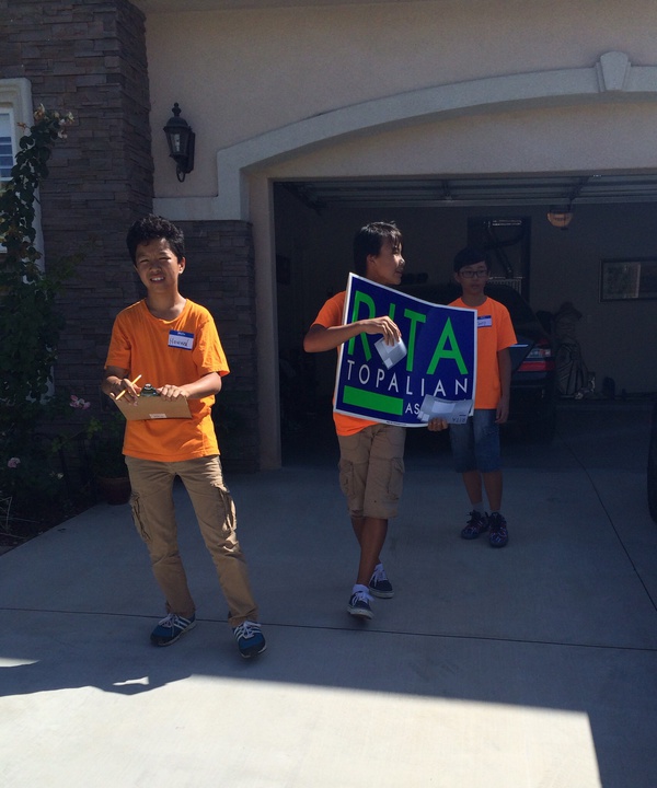 青少年义工被分成7个小分队,在经过简短的培训后,便分头前往各自负责拜票的区域。车上,我所在的小分队三个男孩子已开始在地图标注并计划要走的路线。炎炎烈日下,孩子们拿着Rita的牌子挨家挨户敲门:“你好,我叫Tony Kam, 他叫Howard、他叫Gary,我们都是八年级的学生,为了加州的明天更美好,我们支持Rita, 希望你也支持她。”在Los Altros 大街上连敲了十户门都没人应答的时候,三个男孩差点要哭了,在一通鼓励之下接着敲下一户,终于有人应声开门,“Get out!我是拉丁裔,我支持民主党。”