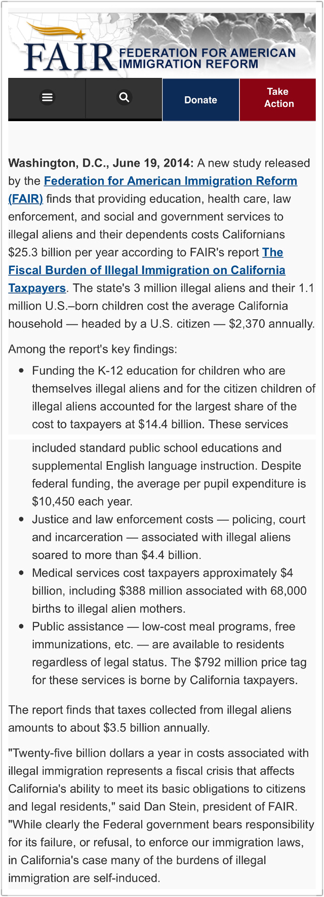 据2014年统计(现在只会更糟),非法移民每年消耗加州218亿美元(253-35够严谨吧😄)。 加州在2013通过“Trust Act", 在去年搞了“Truth Act",今年继续搞庇护犯重罪的非法移民的“避风港湾”,为了这样一个高大上的名称,为了这样无私无底线的大爱,加州人民要在经济上追加每年埋单一亿三千万(因为和联邦对着干,这方面拨款就危险了,除非川普食言或者心软,川普好像两个都不占)。