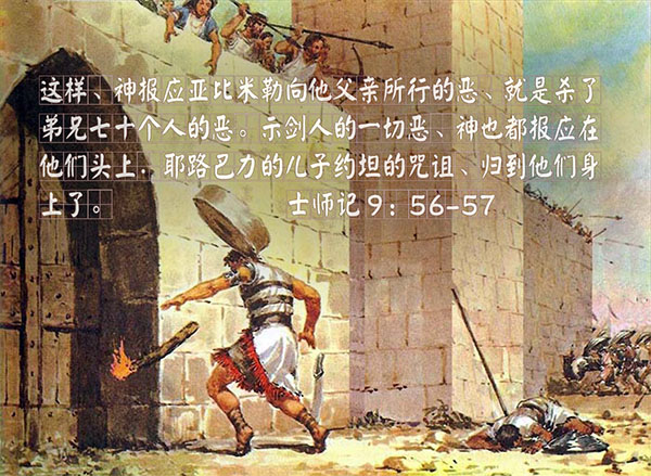 士剑城里的人快被杀光了,还剩下“男女约有一千”,“就躲入巴力比利土庙的卫所”。这个偶像庙的卫所,似乎是士剑城里最后的安全据点,可他们不知道,偶像最终是靠不住的。而且,亚比米勒是个军事天才,知道怎样在保存自己的前题下全歼敌人,他不硬攻,他看准了敌人堡垒的软肋,他采取火攻,当然,这种火攻的损招,只有他这种丧尽天良的人才想得出来。”亚比米勒手拿斧子,砍下一根树枝,扛在肩上,对跟随他的人说,‘你们看我所行的,也当赶紧照样行。’ 众人就各砍一枝,跟随亚比米勒,把树枝堆在卫所的四围,放火烧了卫所。以致士剑楼的人都死了。” 士剑城的人总算让亚比米勒杀干净了。这个凶残的人,杀完了父亲家的弟兄,也杀干净了母亲家合城的人,残忍得不可思议。这个人还是以色列民主选举出来的第一个王。