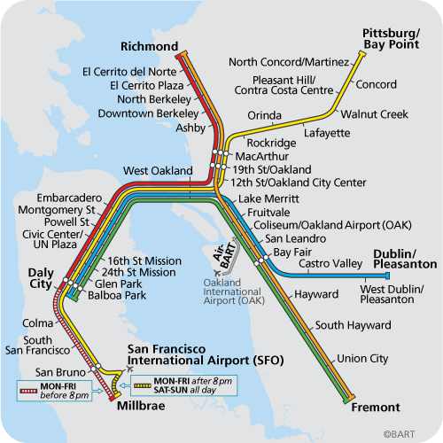 目前灣區捷運的路線營運範圍包括阿拉梅达县、康特拉科斯塔縣、旧金山县和圣马特奥县。