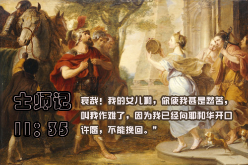 可是,他万万没有料到,这次,“他女儿拿着鼓跳舞出来迎接他,是他独生的,此外无儿无女。” 看见他的独生女儿第一个从家门出来迎接他,耶弗他“就撕裂衣服”,打胜仗的高兴劲儿消失得无影无踪,非常痛苦地指责女儿说,“哀哉!我的女儿啊,你使我甚是愁苦,叫我作难了,”