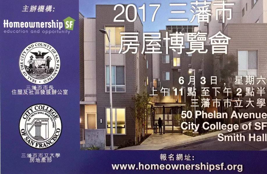 「房屋博览会 + 购房巴士团」住房政策改良会推荐,6月3日星期六上午11am-2pm,HomeownershipSF.org 主辦的房屋博览会,展示各种供您购买的市价房屋和可负担房屋。「地点」三藩市市立大学的Smith Hall,即Smith Hall of City College, 50 Phelan Avenue。「当天行程」首先在市立大学参观各种购屋和家居装修、防地震、贷款等等展览,然后可以乘坐巴士去看楼。其中两辆巴士带大家去看市价屋,一辆带去看可负担房屋。请必须先到 https://www.eventbrite.com/e/2017-san-francisco-housing-expo-tickets-32739316176 报名留位。免费。