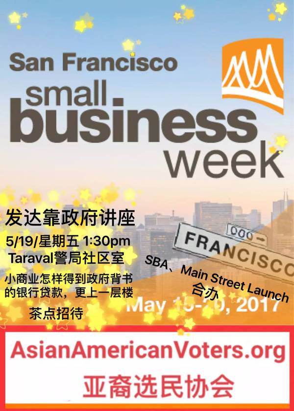 「发达靠政府」5/19下午1:30pm。这是我们亚裔选民协会主办的活动,加州小商业管理局(SBA)和三藩市Main Street Launch、East West Bank合办,教大家怎样去取得政府backed的商业贷款,进行资金周转,扩大生意。发达靠政府!老板们,和想做生意的准老板们可以来参加。已经有六十多人报名,场地是70人就无法走路的了。/:handclap。地点:Taraval警察局社区室,2345 Taraval Street 夹24th Ave
